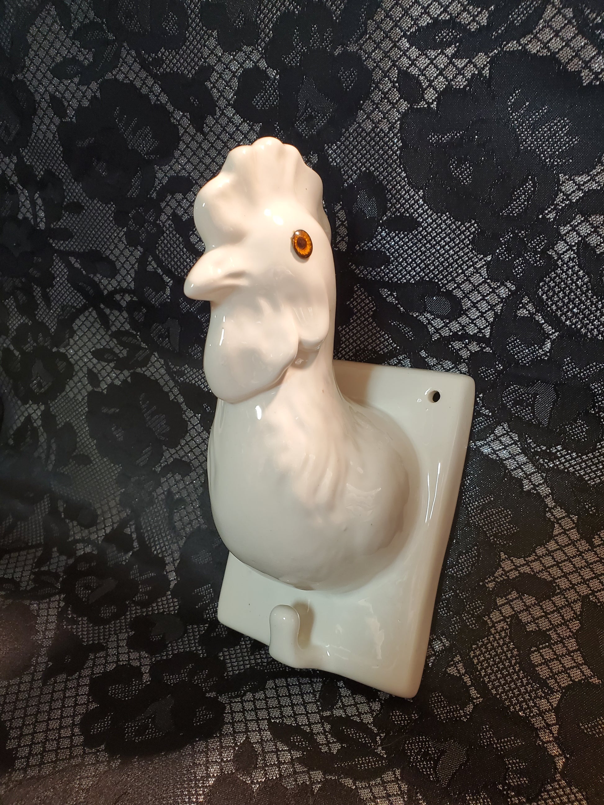Vintage ceramic rooster apron/towel hook. Ready to hang in your kitchen.